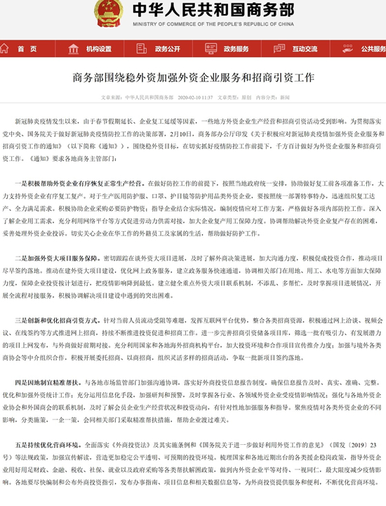 今天上午,商务部办公厅发布《关于积极应对新冠肺炎疫情加强外资企业服务和招商引资工作的通知》: